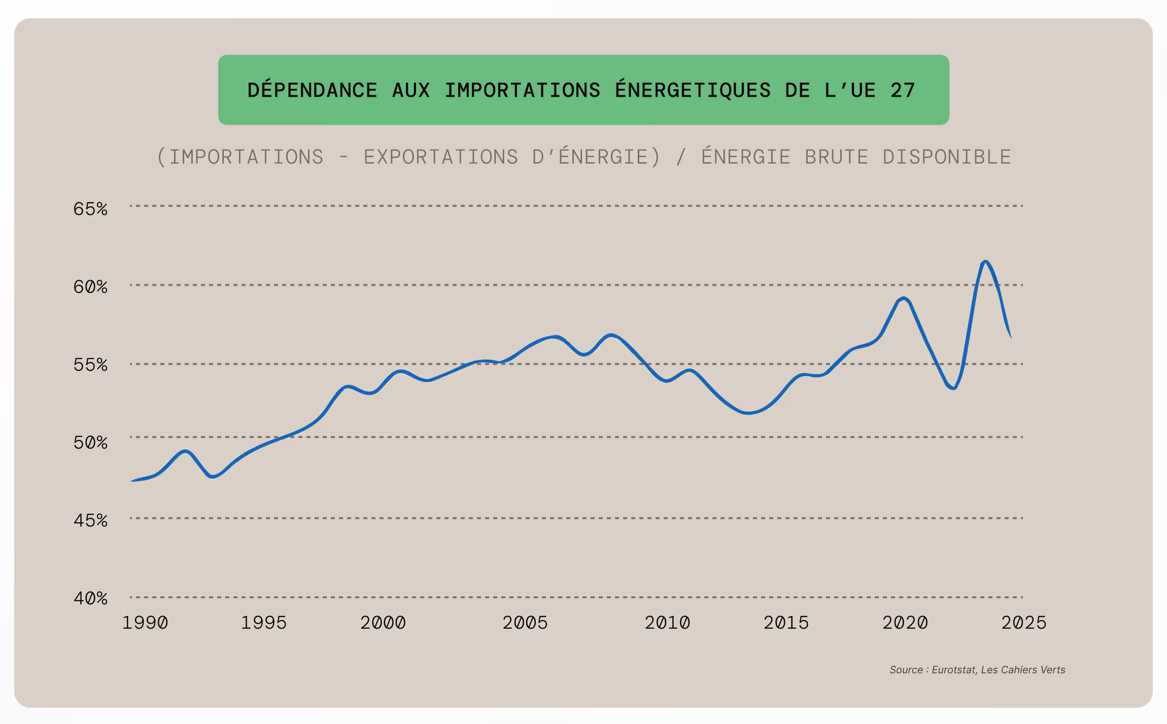 Aujourd'hui, l'UE importe encore 58% de ses besoins d'énergie. Et cette dépendance a augmenté depuis 1990 (50% à l'époque, cf. graphique ci-dessous).